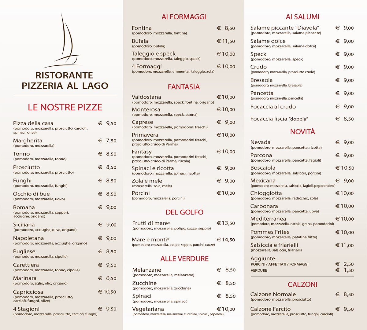 (pomodoro, mozzarella, polipo, seppie, surimi, porcini, cozze)